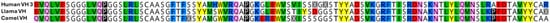 Alignment of the consensus VH sequences from human, llama, and camel (IMGT). The colors are from the Clustal alignment rules. Red for negative charge, blue for positive charge, yellow for aromatic, green for hydrophobic, and pink for polar uncharged amino acid residues.