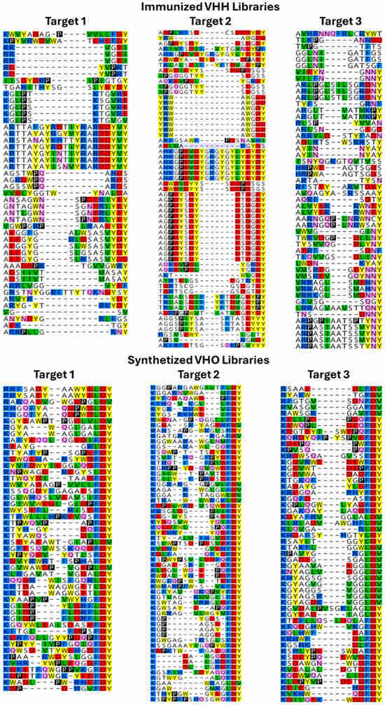Based on previous experiences from Fab-based synthetic and immunized-antibody approaches and how both technologies produced additional candidates, both the de novo synthetic VHO phage display and immunized VHH phage library candidate generation procedures were interacted to the same target proteins. After biopanning, the NGS sequence results for each of the two technology libraries against the same three different targets revealed differences between them. Figure 4 showed an alignment of the most diverse residue arrangement as well as the most surface exposed region, CDR3 [67], for each project per each technology. This CDR3-defined paratope of the VHOs and VHHs was a reflection on antigen epitope recognition. The synthetic VHO candidates showed more diversity in the CDR3 regions compared to the immunized VHH candidates. The immunized CDR3 diversities with these three targets were 59%, 44%, and 70%; while the synthetic CDR3 diversity with the same targets were 87%, 89%, and 94% (Figure 4, respectively, calculated from left to right). Continuing with the comparisons between synthetic and immunized sdAbs were protein behavior (monodispersity) and potency (binding activity). As expected, we found almost all the VHH candidates have good developability behavior compared to 50–80% good behavior within the VHO candidates for the three target protein selections. Also expected was the average of the synthetic VHOs having up to a 10-fold worst potency to targets compared to immunized VHHs. Both important traits were most likely because of somatic mutations that occurred during immunizations. We found residue diversity across the frameworks of the VHHs most likely a relevant result of better developability and potency traits regarding llama/camel immunizations. Contrary to these better behaviors was that such framework diversity could increase immunogenicity. The pros and cons between immunized/natural and phage display/synthetic antibody libraries now have been observed by us in both Fab- and sdAb-based technologies. The pros for immunized libraries include having good developability and potent affinity; and for synthetic libraries having diverse target coverage and less resource requirements. Thus, both natural- and synthetic-sourced antibody technologies could be complementary for candidate generation [27].
