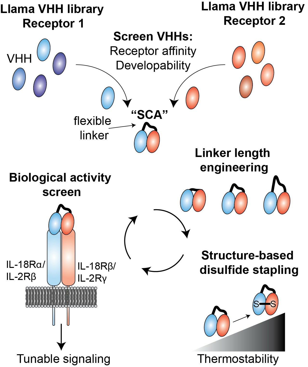 Trenker, R.; Rokkam, D.; Morin, A.; Balasubrahmanyam, P.; Paredes, V.; Cheng, I.; de Waal Malefyt, R.; Oft, M.; Lupardus, P.; Vivona, S. Structure-Guided Stapling of Dimeric Conformations and Linker Engineering Enhance Thermostability and Fine-Tune Activity of Bispecific VHH Cytokine Agonists. Antibodies 2025, 14, 74. https://doi.org/10.3390/antib14030074