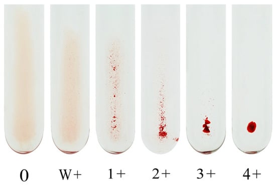The agglutination strength is graded on a scale from 0 (no agglutination) to 4+ (strong agglutination). The antibody titer is defined as the reciprocal of the highest serum dilution yielding a clearly visible agglutination reaction, generally taken as 1+ or stronger. However, some laboratories consider weak positive (w+) reactions as the endpoint, and this inconsistency remains a source of interlaboratory variation. Figure 2 shows an image of the agglutination reaction obtained using CAT.