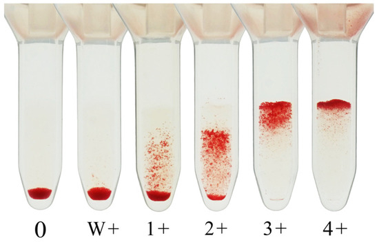 An image of the agglutination reaction obtained using the conventional tube method. W: weak.