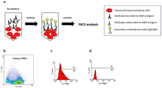 Schematic overview of the FCM for anti-A/B antibodies. (a) Blood group A or B RBCs are incubated with patient serum. After washing away unbound antibodies, they are incubated with a secondary antibody. (b) Gating RBCs. (c) Type B RBCs are incubated with type O serum, which shows a positive reaction. (d) Type B RBCs are incubated with type B serum, which shows a negative reaction. RBCs: red blood cells.