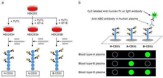 To develop a system for elucidating ABO antigens in a vascular endothelial context, recombinant CD31 proteins (rCD31) carrying ABO carbohydrate structures were produced using genetically engineered HEK293 cells (Figure 4). By introducing specific glycosyltransferases, HEK293 cells were modified to express H- (HEK293H), A- (HEK293A), or B-type (HEK293B) glycan antigens. The extracellular domain of human CD31 was cloned and expressed in these cell lines, resulting in FLAG-tagged rCD31 proteins that are specific to each ABO type (H-CD31, A-CD31, and B-CD31). These recombinant proteins were then purified from the culture supernatant through anti-FLAG affinity chromatography and quantified spectrophotometrically. The purified rCD31 proteins (H-CD31, A-CD31, and B-CD31) were immobilized onto epoxysilane-coated glass slides using a noncontact microarray printer. After blocking, the microarrays were incubated with diluted human plasma to detect the anti-ABO antibodies. Separate fluorescent secondary antibodies were used to detect IgG and IgM binding. The fluorescence signals were quantified using a dedicated scanner and analysis software. The antibody levels were calculated by subtracting the H-CD31 signal (serving as a baseline) from the A-CD31 or B-CD31 signal.