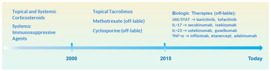 Timeline illustrating the progressive development of treatment options for lichen planus. Before 2000, therapy mainly relied on topical and systemic corticosteroids and broad immunosuppressive agents. In the early 2000s, off-label use of topical tacrolimus, methotrexate, and cyclosporine became more common. Since 2015, the emergence of biologic therapies targeting specific immune pathways—such as JAK/STAT (baricitinib, tofacitinib), IL-17 (secukinumab, ixekizumab), IL 12/23 (Ustekinumab), IL-23 (guselkumab), and TNF-α (infliximab, etanercept, adalimumab)—has marked a shift toward precision immunomodulation in refractory lichen planus.