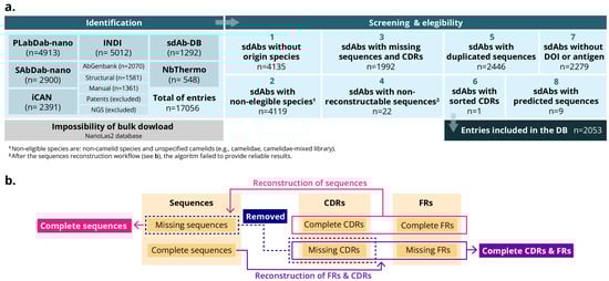 - Sequence verification and reconstruction. Where full-length sequences were unavailable, but all CDRs and FRs were present, complete sequences were reconstructed by concatenating these regions. Entries missing one or more CDRs were removed since they were considered indispensable for downstream analyses. Additionally, to ensure consistent structural representation across entries, a custom Python function was developed which integrates the AbNumber library, which employs ANARCI. This library employs OPIG/IMGT-style antibody numbering to derive FR and CDR boundaries from full-length sdAbs sequences. It can also reconstruct missing elements when sufficient annotations are available. Entries that could not be reconstructed were deleted (Figure 2b).