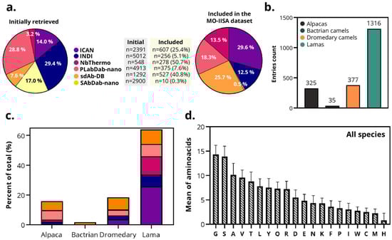 Overview of the MO-IISA database. (a) Initial sdAbs entries collected from each database (iCAN, INDI, SAbDab-nano, sdAb-DB, PLabDab-nano, and NbThermo) before and after screening and application of eligibility criteria. Color legend of the different databases is defined here for the rest of the panels. (b) Number of sdAbs retrieved from each dataset by species of origin (alpacas, Bactrians, dromedaries, and llamas). (c) Proportion of sdAbs retrieved from each database by species, normalized for the total sdAbs of each species. (d) Average frequency distribution of the 20 amino acids across all sdAbs sequences included in the MO-IISA database.