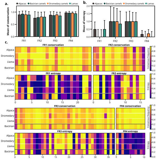 FRs were globally conserved across the MO-IISA database cohort (Figure 4a,b). The overall entropy and conservation data for all species can be found in Figure S1. No significant global differences between species were detected in either conservation or entropy (Kruskal–Wallis, p > 0.05).