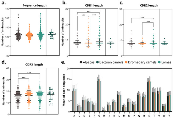 The average length of sdAb sequences across all species was 123.8 ± 7.9 amino acids (aa), corresponding approximately to 13.6 ± 0.9 kDa, within a range of 10.45–18.7 kDa). The average length per species was 123.8 ± 9.0, 124.6 ± 5.1, 123.0 ± 5.4, and 124.0 ± 8.2 aa for alpacas, Bactrians, dromedaries, and llamas, respectively (Figure 5a). No significant differences were observed between species. The relative standard deviation (RSD) of the length was: 7.3%, 4.4%, and 6.7% in alpacas, dromedaries, and llamas; therefore, the length of the sdAb sequences of dromedaries is more homogeneous in length.