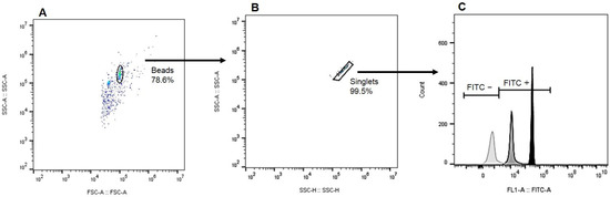 Figure 1. Gating strategy employed for coupling analysis: (A) Bead population delineation based on size (FSC-A) and granularity (SSC-A), (B) Subsequent exclusion of doublets to refine analysis, and (C) A representative histogram depicting the intensity of FITC fluorescence, with the negative control (light gray), a canine representative from the CVL+ symptomatic group (gray), and the IgG positive control (black) for comparison.