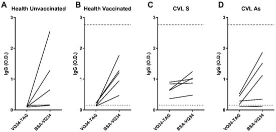 Figure 3. Anti-VQ34-TAG and VQ34-BSA IgG antibodies were evaluated via ELISA in the sera of 5 dogs from each studied group: (A) healthy unvaccinated, (B) healthy vaccinated, (C) CVL+ symptomatic (CVL S), and (D) CVL+ asymptomatic (CVL As). Lines connect the IgG titers obtained with the same sample for each peptide formulation. Absorbance was measured at 450 nm. The dotted line indicates the cut-off for VQ34-TAG, while the dashed line represents the cut-off for VQ34-BSA. Both cut-offs were calculated based on the mean plus 2 standard deviations of the OD values for each antigen in the unvaccinated control group.