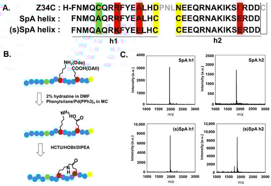 (A) Alignment of α-helical Fc-binding peptides derived from Z34C and their stapled analogs. Residues substituted for lactam stapling are shown in red. Yellow highlights indicate cysteine residues introduced for site-specific conjugation. Green highlights mark a cysteine residue in helix 1 replaced with alanine, which does not interfere with Fc binding but may affect conjugation efficiency. Grey indicates amino acids in Z34C that do not correspond to helix 1 or helix 2. (B) Schematic of the solid-phase lactam stapling reaction. Stapled peptides were synthesized by Fmoc-SPPS using Lys(Dde) and Glu(OAll). (C) MALDI-TOF MS spectra of SpA h1(calculated MW: 1954.89, observed MW: 1956.06), SpA h2 (calculated MW: 1845.9, observed MW: 1846.84), (s)SpA h1(calculated MW: 1968.23, observed MW: 1967.75), (s)SpA h2 (calculated MW: 1844.97, observed MW: 1845.06).
