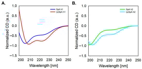 Circular dichroism (CD) analysis of the helix peptides. (A) SpA h1 (blue) vs. (s)SpA h1 (red); (B) SpA h2 (Green) vs. (s)SpA h2 (Cyan).