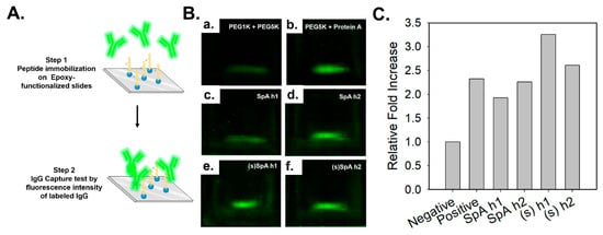To evaluate the Fc-binding capabilities of the synthesized peptides, an IgG capture assay was conducted using FITC-labeled human IgG. As shown in Figure 3A, each peptide was immobilized onto an epoxy-functionalized glass slide pre-modified with PEG linkers via thiol-maleimide coupling, and FITC-labeled human IgG was applied to assess binding interactions [45]. The negative control showed negligible fluorescence (Figure 3B(a)), while the positive control containing Protein A yielded a strong signal intensity (Figure 3B(b)), validating the assay. The stapled peptides, (s)SpA h1 and (s)SpA h2 (Figure 3B(e,f)), demonstrated increased IgG-binding capacity compared to their unstapled counterparts (Figure 3B(c,d)), suggesting stronger binding to human IgG. Notably, (s)SpA h1 exhibited a significantly higher fluorescence intensity, indicating the highest IgG-binding capacity among the four peptides evaluated. This finding is consistent with the CD spectroscopy results, which also revealed the most pronounced α-helical stabilization in (s)SpA h1. These outcomes are consistent with our hypothesis that lactam-based stapling would reinforce α-helicity and enhance binding affinity to the Fc region.