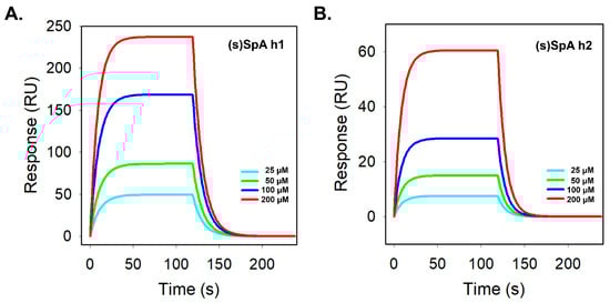 Surface plasmon resonance (SPR) of stapled Fc-binding peptides. SPR sensorgrams depicting the binding interactions of (A) (s)SpA h1 and (B) (s)SpA h2 with immobilized human IgG in DPBS. Peptides were injected at concentrations ranging from 25 to 200 μM.