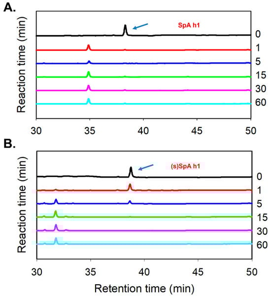 Proteolytic stability of SpA h1 and (s)SpA h1 peptides following α-chymotrypsin treatment. (A) HPLC chromatograms of SpA h1 peptide at various reaction times (0, 1, 5, 15, 30, and 60 min). (B) HPLC chromatograms of stapled SpA h1 analog, (s)SpA h1, under identical conditions. The arrow indicates the elution peak corresponding to the intact peptide.
