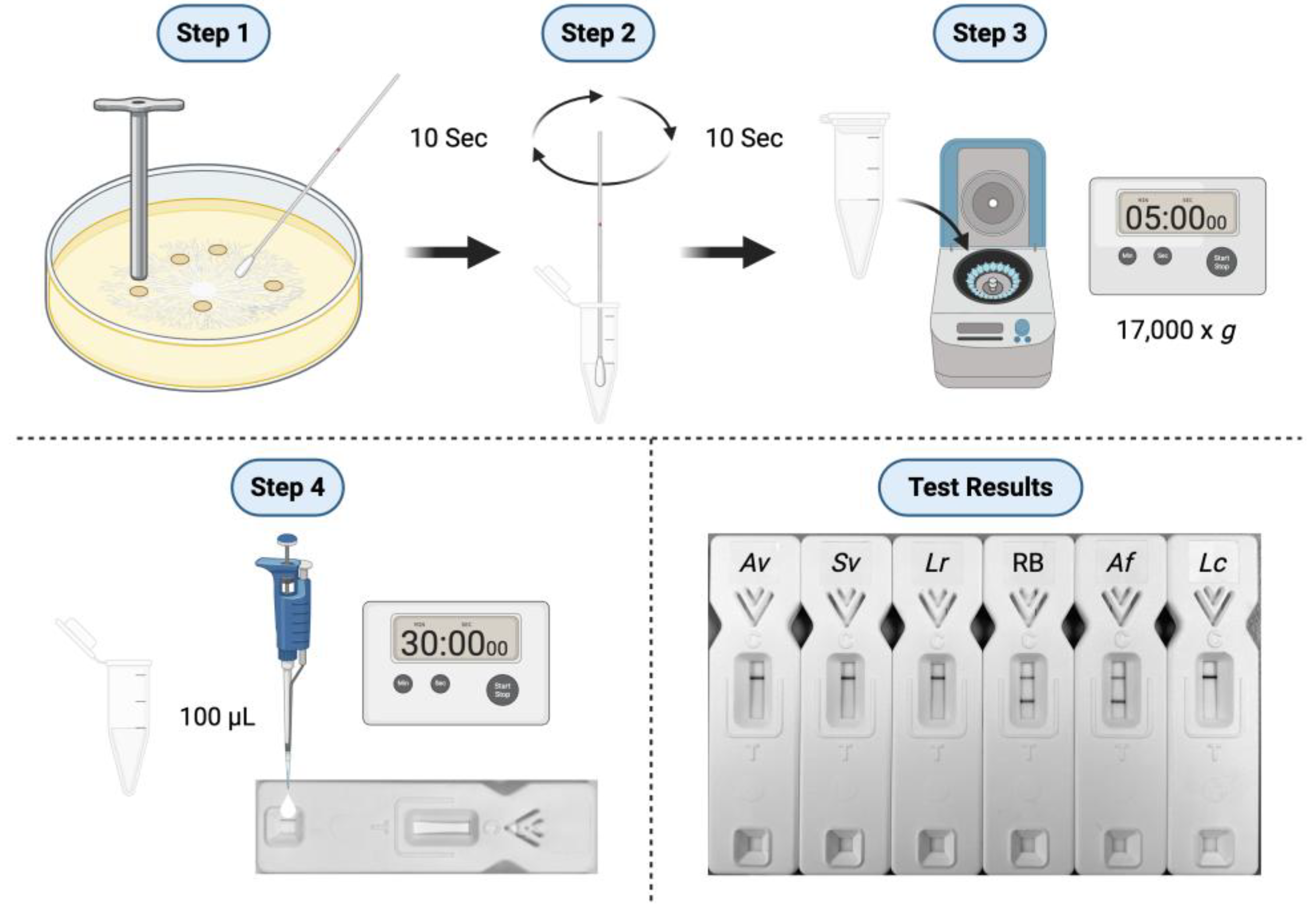 Step 1. Fungus is grown at 37 °C for 24 h on MEA, and five discs of mycelium, prepared using a cork borer, are transferred to YNB + G shake culture. The remaining MEA culture is then swabbed for 10 sec with a disposable sampling swab wetted with TG11-LFD running buffer (RB). Step 2. Soluble antigen is recovered from the swab by rotation for 10 sec in 250 μL RB contained in a 1.5 mL micro-centrifuge tube. Step 3. The tube is centrifuged for 5 min at 17,000× g and the supernatant removed for testing by TG11-LFD. Step 4. One hundred μL of supernatant is added to the sample pad of the LFD, and, after 30 min, the intensities of the test (T) and internal control (C) lines are determined in artificial units (a.u.) using a Cube reader [42,43]. Representative Test Results show complete loss of T lines for swab samples from Av (A. variabilis CBS658.93), Sv (Saksenaea vasiformis CBS113.96), and Lr (L. ramosa DRH226533346), while there is no loss of the T line for Af (Aspergillus fumigatus, strain ΔAfbrlA7). The negative control shown here consists of RB only, while the positive control (Lc) consists of purified EPS from Lichtheimia corymbifera CBS109940 at a concentration of 100 μg/mL RB. The corresponding Cube reader a.u. values for T lines are shown in Table 2.