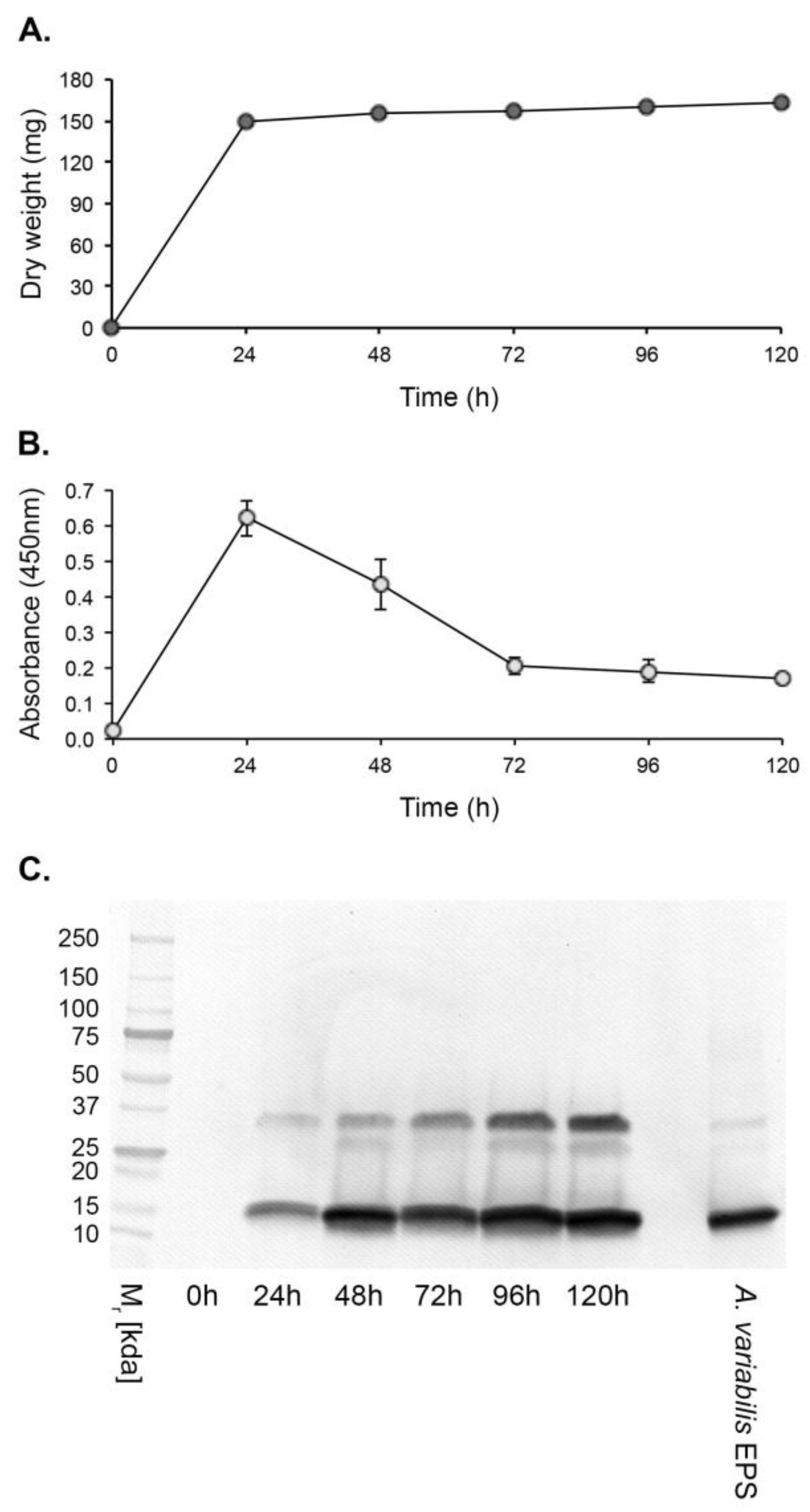 Figure 3. In vitro production of the JD4 antigen by A. variabilis CBS658.93. (A) Dry weights of the pathogen over the 120 h experimental period. (B) Direct-ELISA of YNB + G protein precipitates using mAb JD4. Each data point is the mean of three replicates ± SE (B,C). (C) Western immunoblots of protein precipitates, showing the presence of a 15 kDa immunoreactive protein and a higher-molecular-weight species of ~35 kDa. The positive control consisted of purified A. variabilis EPS antigen at a concentration of 80 ng/mL.