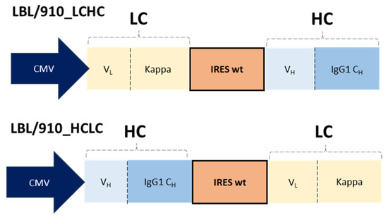 Schematic representation of the bicistronic expression cassettes bearing either the LC (LCHC) or the HC (HCLC) genes as the first cistron. A wild-type EMCV IRES element was used to enable bicistronic expression. In the case of mAb LBL-01, the human IgG1 CH domain contains a LALA mutation [28], whereas for mAb 910-30 a human wild-type IgG1 CH coding sequence was used. CMV: cytomegalovirus promoter; LC: light chain; HC: heavy chain; IRES: internal ribosome entry site; wt: wild-type; VL: light chain variable domain; VH: heavy chain variable domain; CH: heavy chain constant domain.