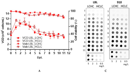 ExpiCHO™ cells (#A29133, ThermoFisher, Waltham, MA, USA) were used for mAb production by transient transfection. For routine maintenance of cells, the viable cell density (VCD) was adjusted every 2–4 days to 0.2–0.5 × 106 cells/mL in 20–25 mL of ExpiCHO™ Expression Medium (ThermoFisher, Waltham, MA, USA), and cells were kept in vented Erlenmeyer flasks in a humidified incubator at 37 °C and 5% v/v CO2, shaken at 125 rpm on an orbital shaker with 25 mm stroke. For transient mAb expression, ExpiCHO™ cells were transfected according to the “standard protocol” for transient expression described in the manufacturer’s instructions. Briefly, cells were expanded and VCD was adjusted to 3–4 × 106 cells/mL in ExpiCHOTM Expression Medium one day before transfection. On the day of transfection (day 0), VCD was adjusted to 6 × 106 cells/mL just before transfection, and cells were transfected using 1 μg of plasmid DNA and 3.2 μL of ExpiFectamine™ CHO reagent (ThermoFisher, Waltham, MA, USA) per mL of cell suspension. On day 1, 6 μL of the ExpiCHO™ Enhancer reagent and 0.24 mL of the ExpiCHO™ Feed (both from ThermoFisher, Waltham, MA, USA) were added per mL of cell suspension. These transient transfections were carried out in duplicate for 9–11 days post-transfection (dpt) at 20 mL working volume in 125 mL Erlenmeyer flasks (for both mAbs) or at 300 mL working volume in 1000 mL Erlenmeyer flasks (for mAb LBL-01 only) under the same conditions of temperature, CO2 atmosphere and agitation as used for routine cell maintenance. VCD and cell viability were determined by the trypan blue exclusion method using a Vi-Cell XR automatic cell counter (Beckman Coulter, Brea, CA, USA). Supernatant samples (3 μL) were analyzed by spot blot assay on a nitrocellulose membrane, using a goat anti-human H+L HRP-conjugated antibody (#A18805, Invitrogen, Waltham, MA, USA) at 1:10,000 dilution, followed by incubation with ClarityTM Western ECL substrate (#1705061, Bio-Rad, Hercules, CA, USA) for chemiluminescent detection.