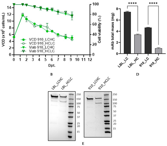 Viable cell density (VCD) and cell viability of transiently transfected ExpiCHO™ cells for expression of (A) mAb LBL-01 and (B) mAb 910-30. Both LCHC and HCLC bicistronic constructs were used to transfect the cells, according to the standard protocol described in the ExpiCHO™ expression kit. Results are shown as the average values of experimental duplicates. (C) mAb LBL-01 and mAb 910-30 secretion detected in cell culture supernatants by spot blot assay. The numbers at the left indicate the respective days post-transfection (dpt) of each sample. For mass yield comparison, a purified human IgG standard at varying concentrations (mg/L) was included as a reference. (D) The contents of each experimental duplicate were pooled together and filtered, yielding in all cases a volume of supernatant of 34 ± 1 mL, which was purified using protein A affinity chromatography. The recovered mass was calculated based on the protein concentration of the main fractions, determined by measuring absorbance at 280 nm. **** Indicates statistically significant difference (p < 0.0001) by one-way ANOVA test followed by Sidak’s multiple comparisons post hoc test (E) The purity of the pooled and concentrated purified fractions was finally confirmed via SDS-PAGE, performed under non-reducing conditions. The fractions corresponding to each elution peak were pooled together and concentrated 2.6×, except in the case of the 910-30 HCLC pool, which was concentrated 4×. Molecular mass marker bands are shown in kDa.