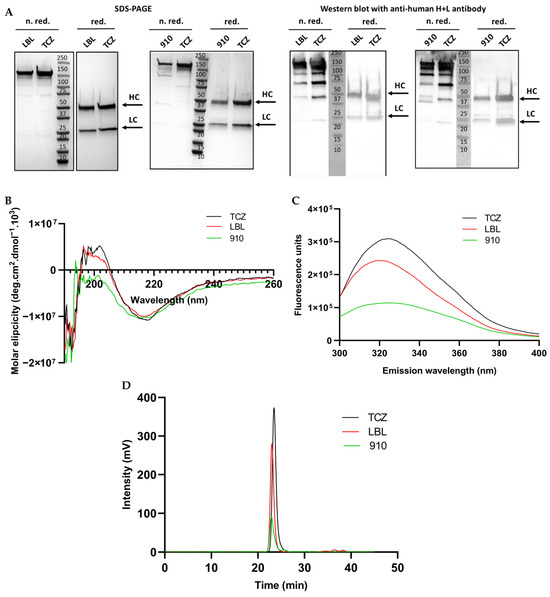 (A) SDS-PAGE (left panel) and Western blot (right panel) of LBL-01, 910-30 and TCZ mAbs for confirmation of purity, identity and molecular mass. Arrows indicate the individual LC and HC bands. Molecular mass marker bands are shown in kDa. (B) Circular dichroism (CD) spectra obtained for LBL-01, 910-30 and TCZ mAbs. Values of molar ellipticity are represented as the mean of five successive collected replicates. (C) Intrinsic fluorescence spectra of tryptophan residues, excited at 280 nm. (D) Quaternary structure analysis performed by SEC-HPLC (the chromatograms shown are representative for the experimental duplicates). The commercial therapeutic humanized mAb tocilizumab (TCZ) was included as a reference IgG1 control. Red: reducing conditions. N. red: non-reducing conditions.