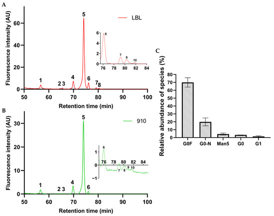 Representative chromatograms of HILIC-HPLC analysis for mAbs (A) LBL-01 and (B) 910-30, carried out to assess the N-glycan profile. (C) LC-MS analysis of mAb LBL-01: relative abundance of glycan species found.