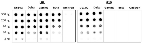 The functionality of LBL-01 and 910-30 mAbs was studied in terms of their capacities to recognize and bind to recombinant trimeric SARS-CoV-2 spike glycoproteins of different variants. This was first accomplished using a qualitative spot blot assay, in which recombinant spike protein of four different variants (D614G, beta, gamma, delta and omicron BA.2) were first added to a nitrocellulose membrane, to which both LBL-01 and 910-30 mAbs were then added (Figure 5). Further LSPR experiments were conducted to quantitatively determine the affinity of the mAbs for different spike variants. Here the mAbs were immobilized by protein A interaction onto the surface of the LSPR sensors, different concentrations of the target spike proteins were added, and the affinity constant (KD) was determined for each case (Table 1). The kinetic curves are shown in Supplementary Materials (Figure S1). Both assays—spot blot and LSPR—showed that mAb LBL-01 was able to target a broader range of recombinant spike variants. As shown in Table 1, no binding was observed to the omicron BA.2 (for both mAbs) and to the gamma variant (only in the case of mAb 910-30). Interestingly, both mAbs were isolated from COVID-19 convalescent patients in 2020, before the emergence of these variants, which emphasizes the importance of the isolating technologies for the identification of potential mAb-based therapeutics for prophylaxis or clinical intervention during pandemic contexts.