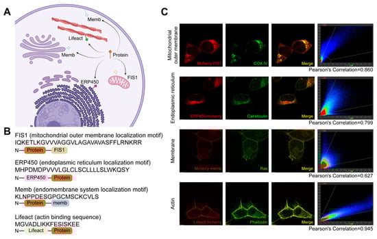 Subcellular localization of proteins directed by localization motifs fusion. (A) Schematic illustration demonstrating localization of exogenous proteins to specific subcellular structures through fusion with localization motifs. Arrows indicate the final localization sites, including the mitochondrial outer membrane, endoplasmic reticulum (ER) surface, endomembrane system surface, and cytoskeleton. Created with BioRender (https://www.biorender.com/, accessed on 4 September 2025). (B) Localization motifs and expression vector design. The FIS1 is derived from the C-terminal transmembrane segment of yeast Fis1 protein; ERP450 consists of a 27-amino-acid ER-targeting motif from cytochrome P450; Memb is derived from the C-terminal region of HRAS; Lifeact is a 17-amino acid peptide from the N-terminus of the actin-binding protein ABP140. (C) Co-localization analysis of mCherry fused with individual localization motifs and subcellular structures. Strong co-localization was observed, with Pearson’s correlation coefficients > 0.6. Scale bar, 5 μm.