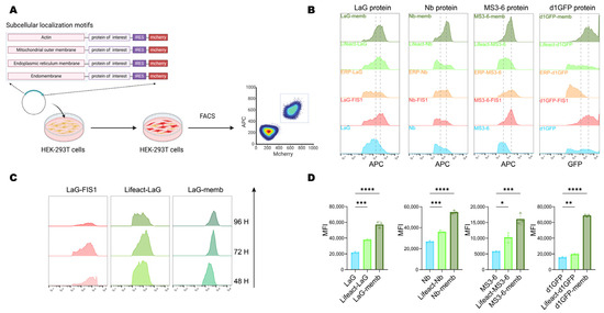Protein level and accumulation induced by subcellular localization motifs. (A) Schematic diagram of the workflow for analyzing the accumulation efficiency of exogenous proteins in cells. Plasmids carrying target proteins with different subcellular localization signals were transiently transfected into HEK-293T cells, and the content of the target protein in double-positive cells was analyzed by flow cytometry after 72 h. Created with BioRender (https://www.biorender.com/, accessed on 4 September 2025). (B) Flow cytometry analysis of the accumulation efficiency of exogenous proteins fused with different localization motifs. The unfused construct served as a control. The two dashed lines represent the mean fluorescence intensity (MFI) of the unfused construct and memb fusion, respectively. (C) Prolonged cell culture post-transfection to observe the content of target proteins localized to the mitochondrial outer membrane, intracellular membranes, and cytoskeleton. (D) Flow cytometry analysis of the mean fluorescence intensity (MFI) for target proteins localized to endomembrane and cytoskeleton in HEK-293T cells 72 h after transfection. Mean values ± SD of three independent biological experiments. Statistical analyses of LaG proteins (**** p < 0.0001 and *** p = 0.0003), Nb proteins (**** p < 0.0001 and *** p = 0.0001), MS3-6 proteins (*** p = 0.0002 and * p = 0.0127), and d1GFP proteins (**** p < 0.0001 and ** p = 0.0032) were carried out with one-way ANOVA followed by Tukey’s multiple comparisons test.