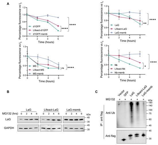 Subcellular targeting to the endomembrane or cytoskeleton reduces the degradation rate and ubiquitination level of exogenous proteins. (A) Protein degradation rates under different localization motifs. HEK293T cells were transiently transfected with plasmids encoding various subcellular localization motifs and subsequently treated with the protein synthesis inhibitor cycloheximide (CHX). Samples were collected at 0-, 2-, 4-, or 6-h post-treatment, and the mean fluorescence intensity of the target protein in cells was measured. The fluorescence intensity at 0 h was normalized to 100% for each construct. Mean values ± SD of three independent biological experiments. Statistical analyses of d1GFP proteins (**** p < 0.0001), LaG proteins (**** p < 0.0001 and ** p = 0.0010), MS3-6 proteins (**** p < 0.0001 and ns = 0.1216), and Nb proteins (**** p < 0.0001 and * p = 0.0151) were carried out with two-way ANOVA followed by Tukey’s multiple comparisons test. (B) Accumulation of target proteins after proteasome inhibition. Cells transfected with different constructs were treated with the proteasome inhibitor MG132 for 0, 2, 4, or 6 h. Target protein levels were analyzed by western blotting, with GAPDH used as the internal loading control. Mean values ± SD of three independent biological experiments. (C) Ubiquitination levels of subcellularly targeted fusion proteins. Equal amounts of transfected cells were lysed and subjected to immunoprecipitation using anti-FLAG antibodies. Vector and GFP constructs served as negative controls. Mean values ± SD of three independent biological experiments. Numbers at the bottom are the values of ubiquitination levels of Lifeact-LaG or LaG-memb relative to that of LaG, which is set to 1.00.
