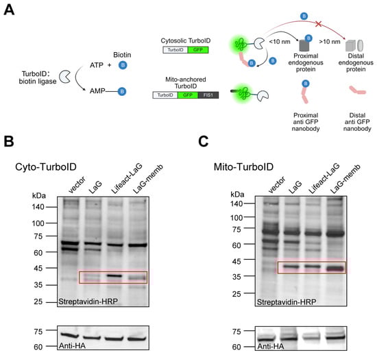 We have proved that altering the subcellular localization of exogenous proteins in the cytosol can enhance their stability. Most proteins, particularly antibodies, rely on interactions with other proteins to function. However, whether artificially changing a protein’s localization affects its binding to other proteins and thus its functionality remains unclear. Therefore, we employed proximity labeling to investigate how altered localization impacts protein–protein interactions. Compared to traditional methods like co-immunoprecipitation (Co-IP) or yeast two-hybrid (Y2H), proximity labeling (e.g., TurboID) allows us to target a labeling enzyme to specific organelles, generating markers near the protein of interest to capture neighboring interacting molecules. This approach better reflects protein interactions within the cellular microenvironment, making it ideal for our study. Here, we used GFP as an antigen and its dimeric nanobody LaG as a model system to assess how spatial positioning affects antibody accessibility. We localized GFP either freely in the cytosol or anchored to the mitochondrial surface to evaluate how LaG’s subcellular localization influences its function. By fusing TurboID to GFP, we biotinylated nearby proteins, then identified them using streptavidin-HRP to quantify LaG binding (Figure 4A).