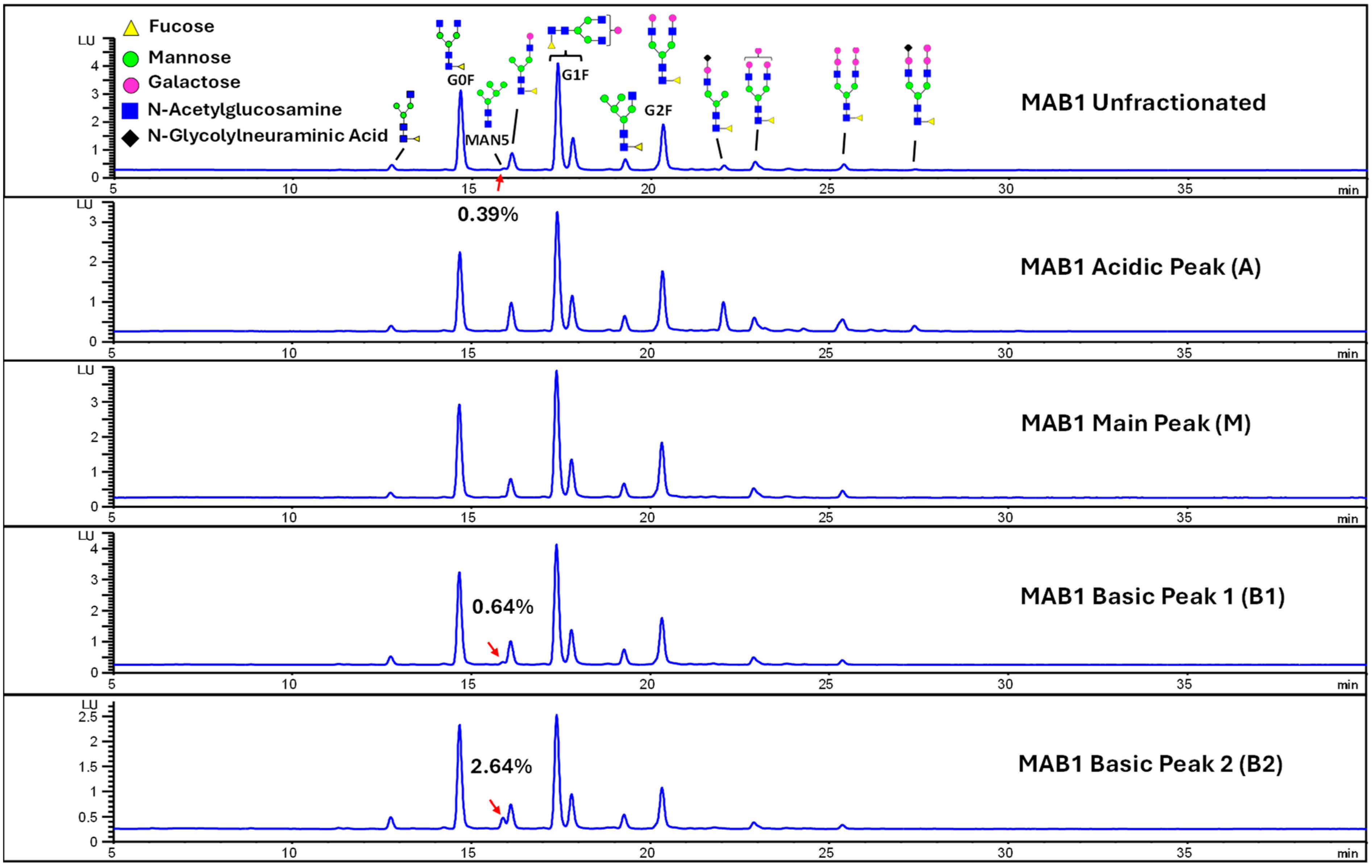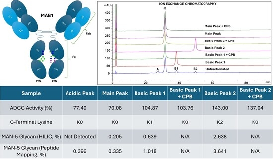 3.3. Glycosylation of MAB1 and the Charge Variants Analyzed by Hydrophilic Interaction Chromatography (HILIC)