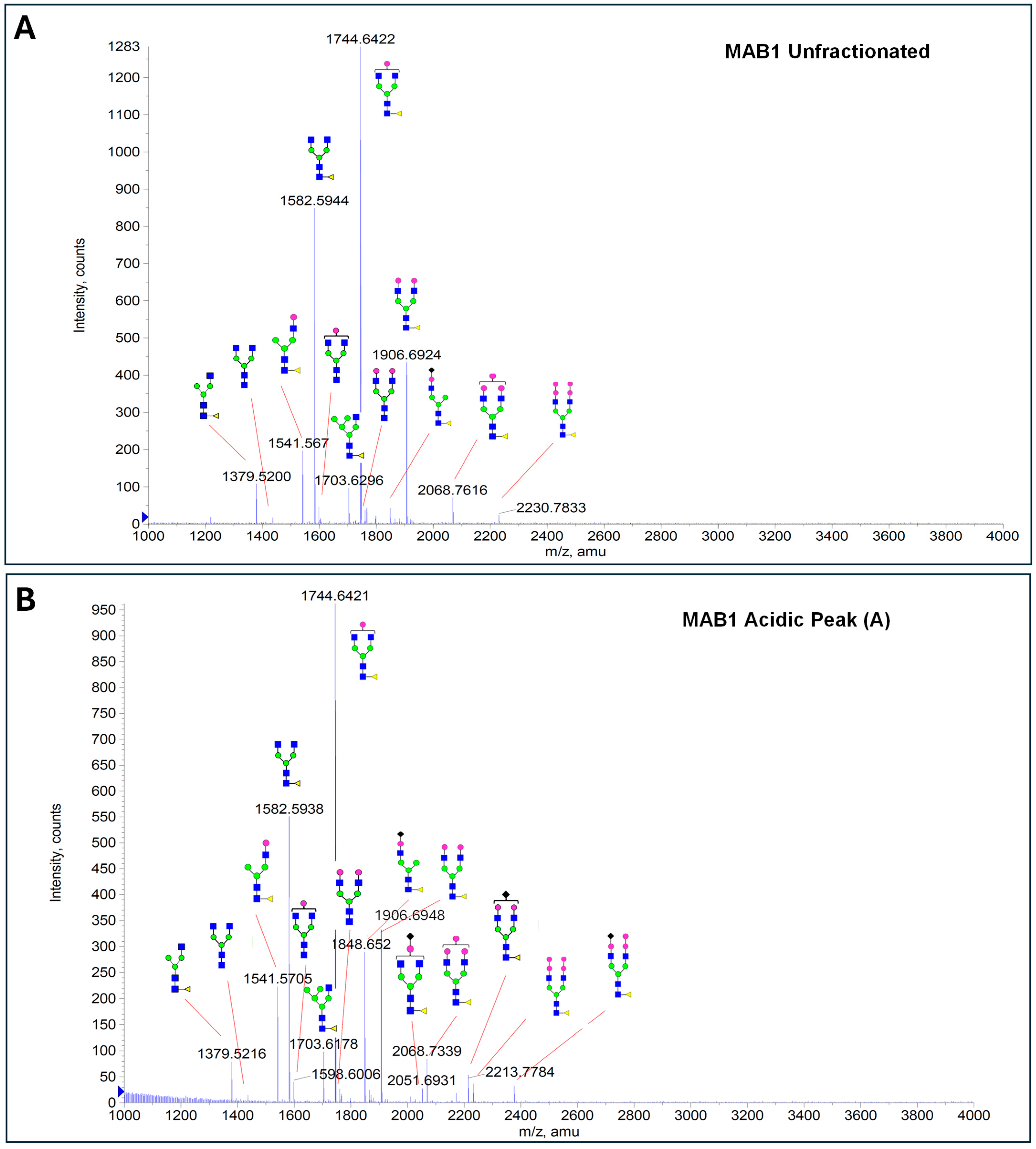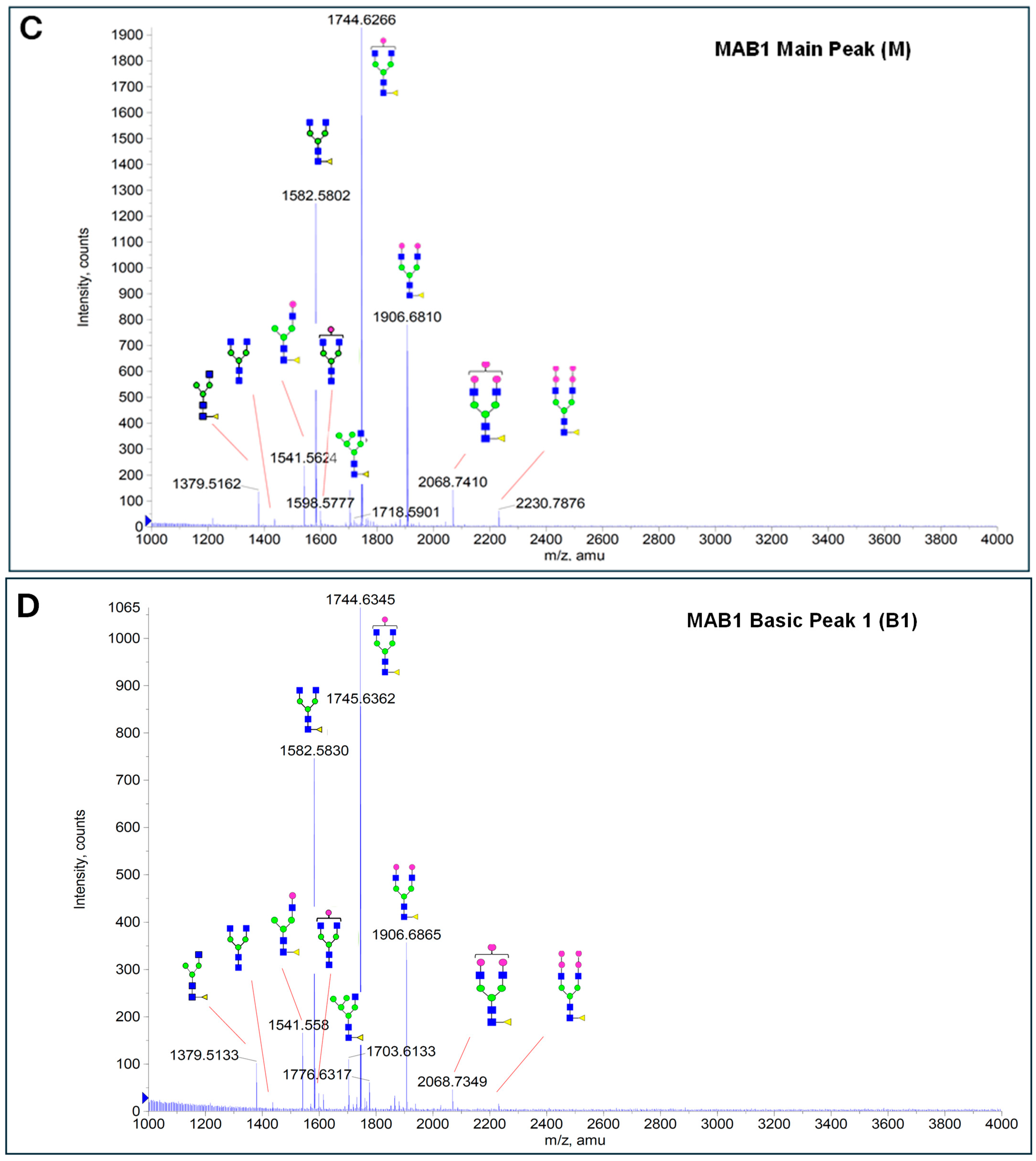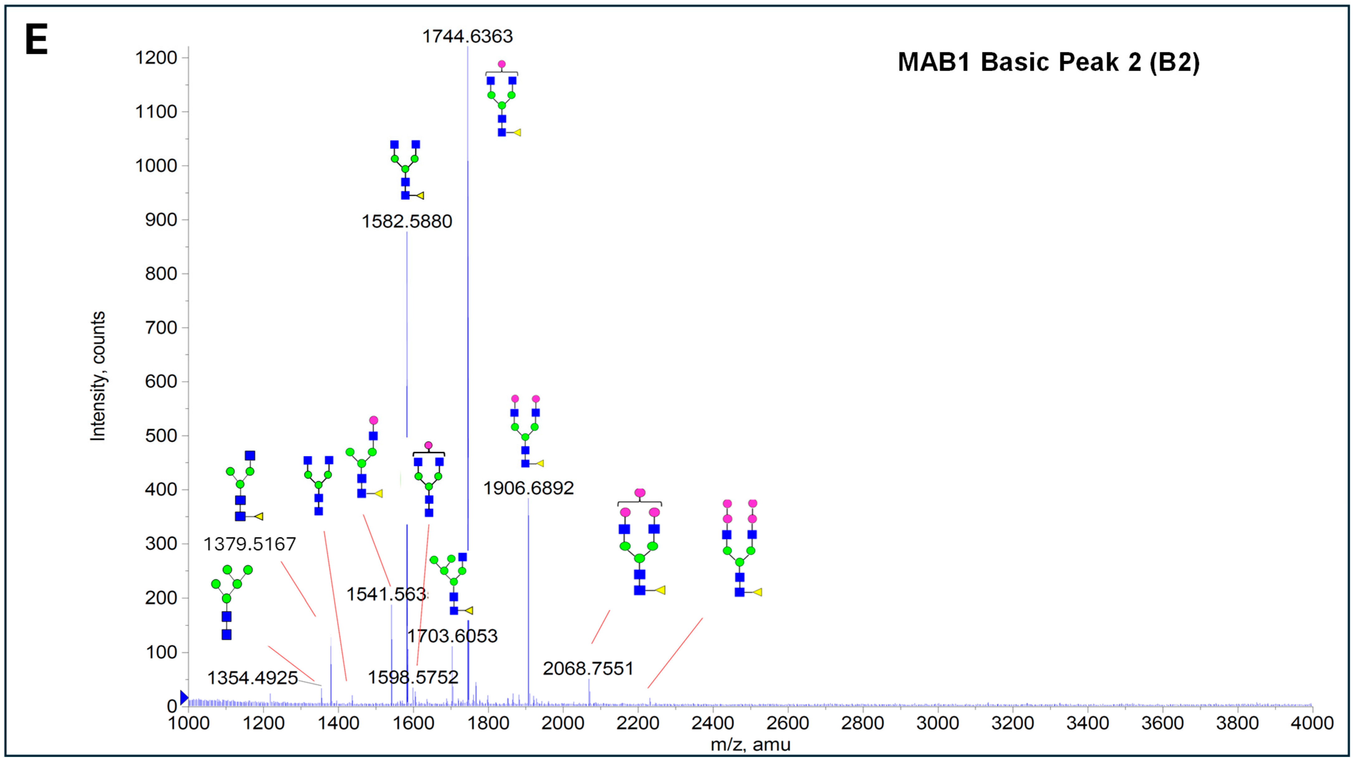 3.4. Glycosylation of MAB1 and the Charge Variants Analyzed by QTOF-MALDI Mass Spectrometry