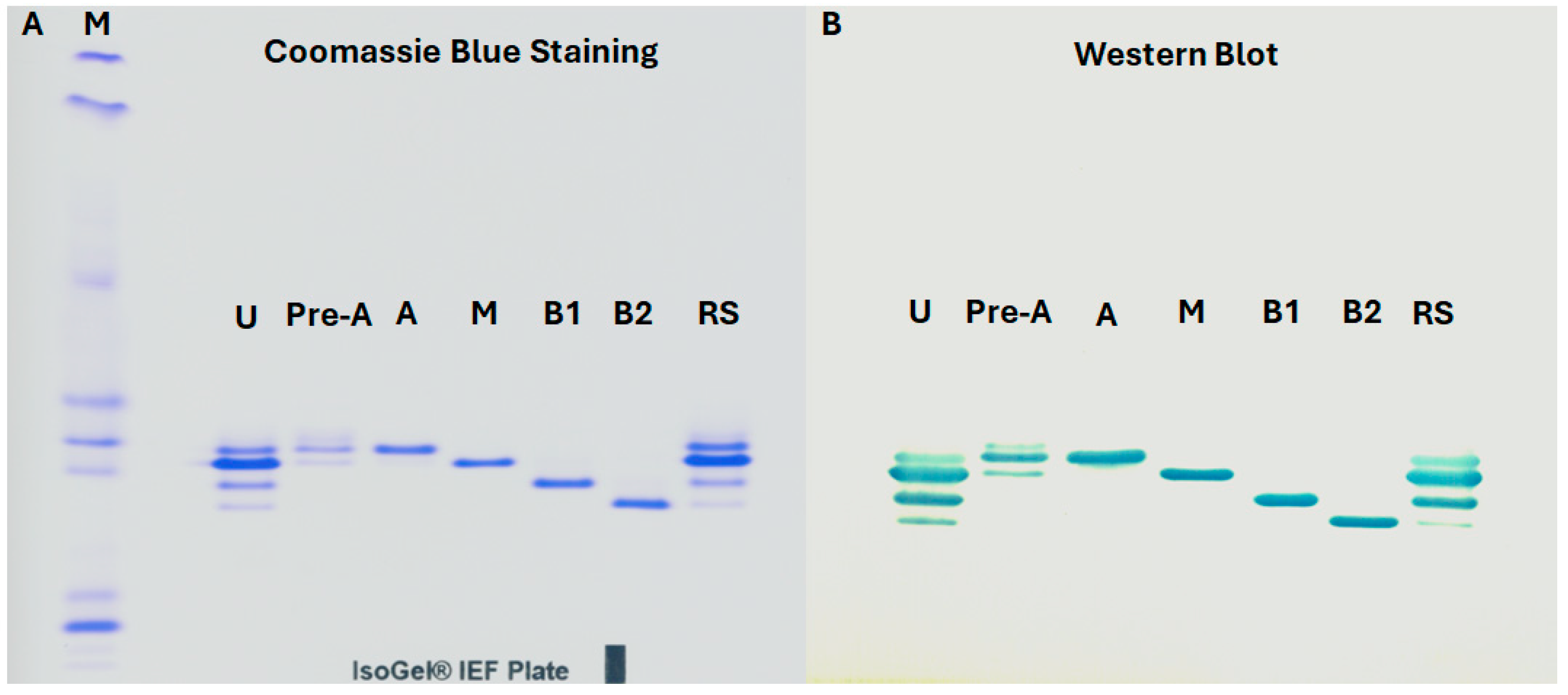 2.4. IEF (Isoelectric Focusing) by Agarose Gel Electrophoresis and Western Blot