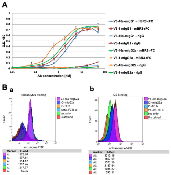 Evaluation of the binding ability of V3-1/V3-46s mIgG1 and V3-1/V3-46s mIgG2a to BR3-rFC and to BR3-expressing cells by ELISA and FACS. (A) The binding abilities of all four antibodies were assessed by ELISA. The plate was coated with 5 μg/mL of mBR3-rFC or 5 μg/mL rIgG and blocked with 3% skim milk. 3-fold dilutions starting with 50 nM antibody were added and detected with HRP-conjugated goat anti-mouse H+L antibody. Data are presented as mean ± SD are shown. (B) Evaluation of the binding ability of V3-46s mIgG2a to splenocytes/i29 cells by flow cytometry. Histograms of flow cytometry analysis assessing the binding abilities of V3-46s mIgG2a towards BR3 on both splenocytes and i29 cells. The cells were incubated for 30 min at room temperature with the relevant primary mAb (IC/V3-46s mIgG2a) at a concentration of 5 µg/mL. Detection was performed using goat anti-mouse FITC/AF488 as a secondary antibody. Data analysis was conducted using Kaluza software. (B(a)) V3-46s mIgG2a binding to splenocytes with the presence or absence of FC-blocker (Miltenyi 130-092-575). (B(b)) V3-46s mIgG2a binding to i29 cells with the presence or absence of Fc-blocker (Miltenyi).