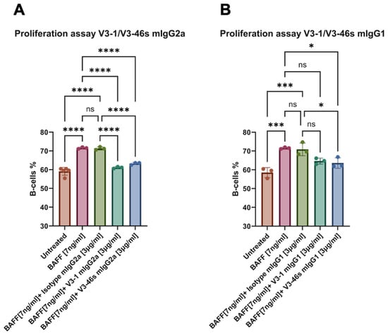 B220+ B-cell proliferation analyzed by flow cytometry. (A) mice treated with mouse IgG2a antibodies, (B) mice treated with IgG1 antibodies. Splenocytes from C57BL/6 mice (1 × 106 cells/mL) were treated with or without the following: BAFF [7 ng/mL], mIgG2a isotype control mAb (clone-c1.18.4) [3 µg/mL], mIgG1 isotype control mAb (clone- MOPC-21) [3 µg/mL], V3-1 mIgG2a mAb [3 µg/mL], V3-46s mIgG2a mAb [3 µg/mL], V3-1 mIgG1 mAb [3 µg/mL], V3-46s mIgG1 mAb [3 µg/mL], and cultured for 72 h at 37 °C. Cells were then stained for B220 and visualized on a CytoflexL4. * p < 0.05, *** p < 0.001, **** p < 0.0001. ns, without statistical significance (p > 0.05).