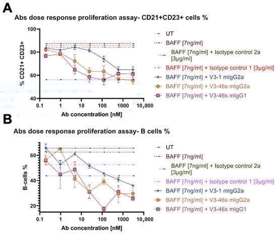 After this assay, we chose to continue with V3-1 mIgG2a, V3-46s mIgG2a, and V3-46s mIgG1 to a dose–response proliferation assay. In this experiment, we expected to evaluate which of the mAbs better reduces B-cell percentages at lower concentrations. We tested both a specific B-cell population (CD21+ CD23+, Follicular B-cells), in Figure 3A, and a general B-cell population in Figure 3B. As shown in both Figure 3A,B, the mAbs reduced the percentage of B-cells in a dose-dependent manner. While in both populations, at the higher concentrations, V3-46s mIgG2a is the antibody that has the greater reduction. Interestingly, in Figure 3B, it is also shown that the mIgG1 isotype control causes a reduction in B-cells percentage, in comparison to the BAFF-only treatment.