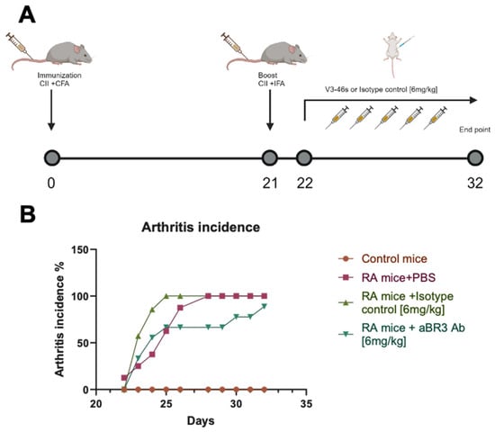 An in vivo experiment was conducted to evaluate V3-46s mIgG2a antibody’s therapeutic abilities. The experimental design is illustrated in Figure 4A. Mice that were injected with CFA+ collagen are labeled as RA mice, and mice that were injected with CFA+ PBS are labeled as control mice. Based on effective antibody doses that were used to treat mice models in [24] and with BAFF-Trap in [15], RA mice were treated with 6 mg/kg of V3-46s mIgG2a, the appropriate isotype control, and PBS as an additional control, by five intraperitoneal injections. The mice’s arthritic scores were monitored daily, and on day 32, the experiment ended. As shown in Figure 4B, the control mice had an arthritis incidence of 0% throughout the entire experimental time, the RA+PBS mice group reached 100% arthritis incidence by day 28, the RA+IC mice group reached 100% arthritis incidence by day 25, and the RA+anti-BR3 mice group reached a maximal arthritis incidence of 88% by day 32 (Figure 4B). These results suggest that treatment with V3-46s mIgG2a delays the development of arthritis compared to the controls.