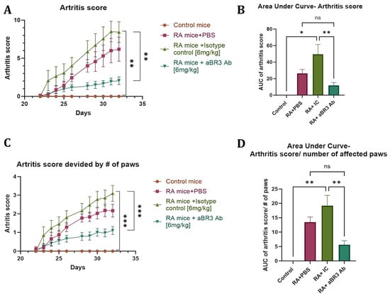 Clinical evaluation of arthritis score. (A,B) The mice were graded regularly for signs of arthritis. Statistical significance was analyzed by one-way ANOVA using GraphPad Prism 10.2 and is shown as mean ± SEM of both the score at day 32 and the calculated AUC. * p < 0.05 and ** p < 0.01. ns, without statistical significance (p > 0.05). (C,D) The total score was divided by the number of affected paws in each mouse. Statistical significance was analyzed by one-way ANOVA using GraphPad Prism 10.2 and is shown as mean ± SEM of both the score at day 32 and the calculated AUC. ** p < 0.01, *** p < 0.001. ns, without statistical significance (p > 0.05). Sample sizes: Control mice group (n = 2), RA+PBS mice group (n = 8), RA+IC mice group (n = 7), and RA+anti-BR3 mice group (n = 9).