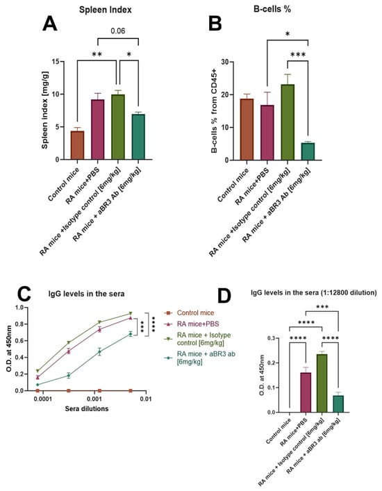 (A) Spleen index. Spleen weight [mg]/body weight [g] ratio. Increased ratio of spleen weight/total body weight in CIA mice is consistent with spleen enlargement. Statistical significance was analyzed by one-way ANOVA using GraphPad Prism 10.2 and is shown as mean ± SEM. * p < 0.05, ** p < 0.01. (B) B-cell population in the spleen. Single-cell suspensions from splenocytes were stained using conjugated antibodies. B-cells were defined as CD45+B220+. Statistical significance was analyzed by one-way ANOVA using GraphPad Prism 10.2 and is shown as mean ± SEM. * p < 0.05, *** p < 0.001. (C,D) Anti-Collagen antibodies in the sera. The levels of anti-collagen antibodies in the mice sera were evaluated by ELISA. Data was analyzed by one-way ANOVA using GraphPad Prism 10.2 and is shown as mean ± SEM. *** p < 0.001, **** p < 0.0001. Sample sizes: Control mice group (n = 2), RA+PBS mice group (n = 8), RA+IC mice group (n = 7), and RA+anti-BR3 mice group (n = 9).