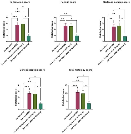 Histological evaluation of the joints. Bar graphs depict the mean (±SEM) for the histological scores, with separate scores for inflammation, pannus formation, bone resorption, cartilage damage, and total histology score; the scores were divided by the ratio of affected joints/number of joints on the slide. Statistical significance was analyzed by one-way ANOVA using GraphPad Prism 10.2 and is shown as mean ± SEM. * p < 0.05, ** p < 0.01, and *** p < 0.001. Sample sizes: Control mice group (n = 2), RA+PBS mice group (n = 8), RA+IC mice group (n = 7), and RA+anti-BR3 mice group (n = 9).