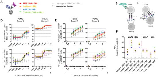 Co-stimulatory activity of CEA-4-1BBL molecules on primary human T cells. (A) Tested CEA-4-1BBL bispecific molecules. (B) Schematic display of the assay with CD3 IgG1. (C) Schematic display of the assay with CEA-TCB. (D) CEA-4-1BBL molecules were titrated and incubated with human PBMCs from two different donors, 45 Gy-irradiated MKN-45 tumor and 2 nM agonistic CD3 human IgG1 V9 antibody delivering signal 1, as indicated. After 4 days, T cells were analyzed by flow cytometry. The frequency of CD25 upregulation in the parental CD4 or CD8 T cell population was determined as indicated. Each point is the mean of technical triplicates. Error bars indicate the standard deviation. Only one experiment was performed. (E) Human PBMCs from two different donors were incubated with 45 Gy-irradiated MKN-45 tumor cells, titrated CEA-TCB and 1 nM CEA- 4-1BBL molecules, as indicated. After 4 days, T cells were analyzed by flow cytometry. The frequency of CD25 upregulation in the parental CD4 or CD8 T cell population was determined. Each point is the mean of technical triplicates. Error bars indicate the standard deviation. Only one experiment was performed. (F) Area under the curve (AUC) was calculated from both assays and baseline-corrected by subtracting the AUC value from the DP47-4-1BBL control. The mean is shown.
