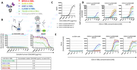 Reporter cell line assay: NFkB-downstream signaling after 4-1BB activation was measured by co-culturing 2 × 103 Jurkat-human-4-1BB-NFkB-luc2 reporter cells with 1 × 104 tumor cells or CEACAM5-transfected CHO-k1 cells in 384-well flat-bottom white plates (Corning, New York, NY, USA 3826). Titrated CEA-4-1BBL molecules were added, and the plates were incubated for 5 h at 5% CO2 and 37 °C. For one experiment, a fixed dose of 1 nM CEA-4-1BBL was used and different concentrations of soluble CEACAM5 (BioRad, Basel, Switzerland, PHP282) were added (starting dose: 190 nM, titrated in 1:5 dilution steps). Afterwards, One-Glo Luciferase reagent (Promega, Walldorf, Germany E6110) was added, and luminescence was measured for 0.5 s/well using a Tecan Spark plate reader.