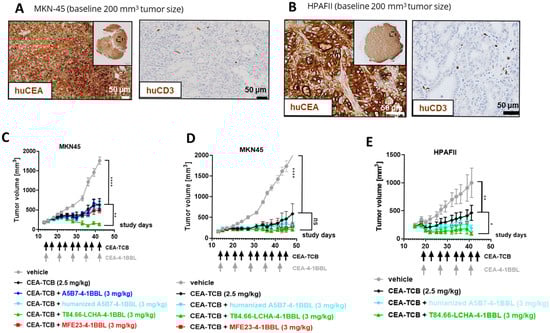 CEA-4-1BBL-mediated tumor growth inhibition in humanized mice (A,B) The human CEACAM5 expression and human CD3+ cell infiltration measured by IHC on FFPET at a tumor size of 200 mm3 before treatment of MKN-45 or HPAFII tumors are shown. (C) CD34+ human cord blood humanized NOG mice received a subcutaneous injection of MKN-45 tumor cells. When a tumor volume of around 200 mm3 was reached, the mice were randomized and treated with the vehicle (gray filled circle) or 2.5 mg/kg CEA-TCB (black filled diamond) twice per week. Four of the six groups received a combination treatment of 2.5 mg/kg CEA-TCB twice per week and 3 mg/kg CEA-4-1BBL once per week (the different colors indicate CEA-4-1BBL molecules implementing different CEACAM5 binders). The schedule of treatment is indicated along the x-axis; tumor growth in mm3 is indicated along the y-axis. Each point indicates the mean for 10 mice; error bars show the standard error of the mean (SEM). (D) A repetition of the experiment shown in C with indicated molecules. (E) A repetition of the experiment shown in C but with HPAFII tumor cells instead of MKN45 with indicated molecules. Statistical analysis was performed using 1-way analysis of variance (ANOVA), and significant p values are indicated as follows: ns: not significant; * p < 0.05; ** p < 0.01; **** p < 0.0001.