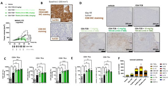 Finally, the potential of the different CEA-4-1BBL antibody fusion proteins as signal 2 providers in combination with CEA-TCB was tested in vivo in human CD34+ stem cell humanized NSG mice bearing subcutaneous human gastric adenocarcinoma MKN-45 or human pancreatic adenocarcinoma HPAFII xenografts. Both models exhibit comparable and high CEACAM5 expression and low CD3 T cell infiltration at baseline (Figure 4A,B), making them xenograft models with good translational potential for colorectal, gastric and pancreatic cancers. All treated mice exhibited reduced tumor growth relative to the vehicle. Notably, only T84.66-LCHA-4-1BBL consistently demonstrated significant tumor growth control across the performed experiments as a combination partner with CEA-TCB when compared with CEA-TCB monotherapy (Figure 4C–E). To establish this activity further and evaluate the dose–response relationship, T84.66-LCHA-4-1BBL was evaluated at three different doses in the MKN45/3T3 co-grafting tumor model in humanized NSG mice [24]. Administration of T84.66-LCHA-4-1BBL at all three tested doses (1, 3 and 10 mg/kg) resulted in the enhancement of CEA-TCB-mediated tumor growth inhibition (Figure 5A), exhibiting a clear dose-dependent trend. Furthermore, treatment with all three doses resulted in comparable immuno-pharmacodynamic effects in the tumor, as evidenced by flow cytometric analysis of human CD4+ and CD8+ T cell infiltration (Figure 5C). Consistently, immunohistochemistry (Figure 5D,E) demonstrated a significant increase in intratumoral human T cell density. Lastly, an increased accumulation of cytokines within the tumor was observed in the combination groups over CEA-TCB monotherapy at the study endpoint on day 44 (Figure 5F).