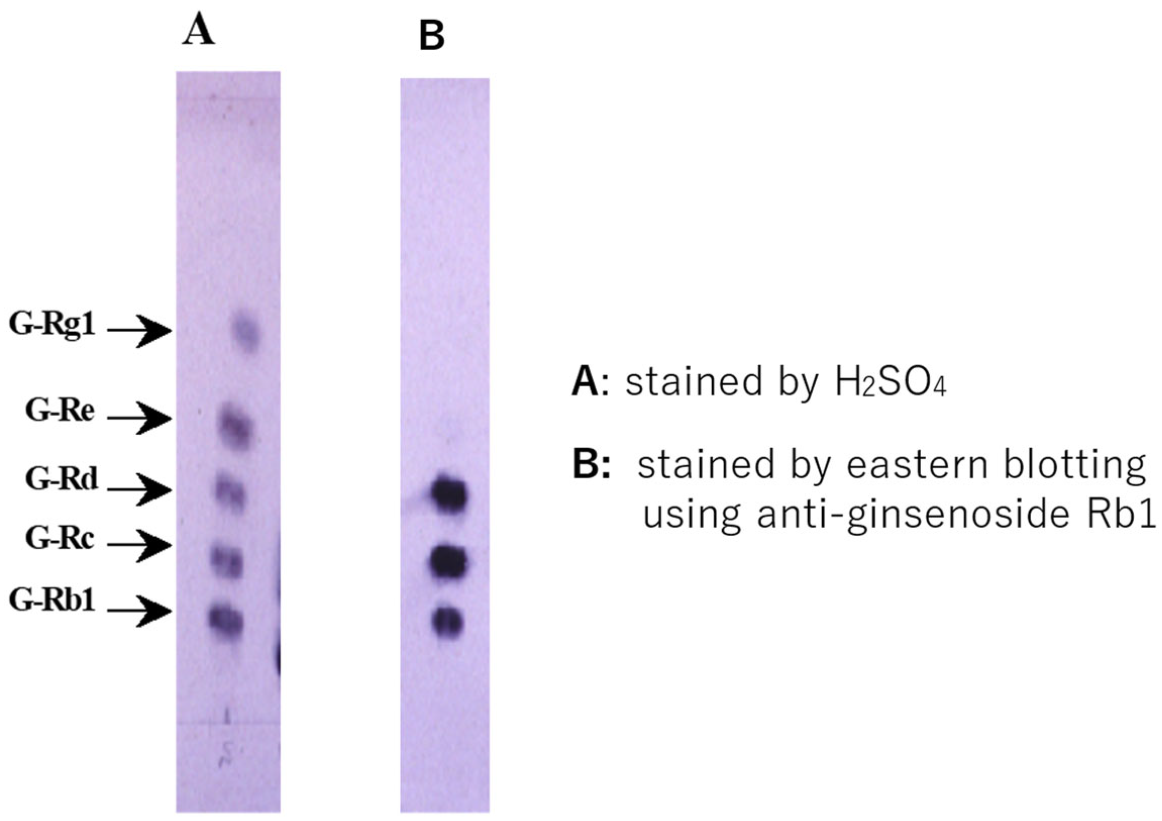 - Morinaga, O.; Tanaka, H.; Shoyama, Y. Detection and quantification of ginsenoside Re in ginseng samples by a chromatographic immunostaining method using monoclonal antibody against ginsenoside Re. J. Chromatogr. B 2006, 830, 100–104. [Google Scholar] [CrossRef]