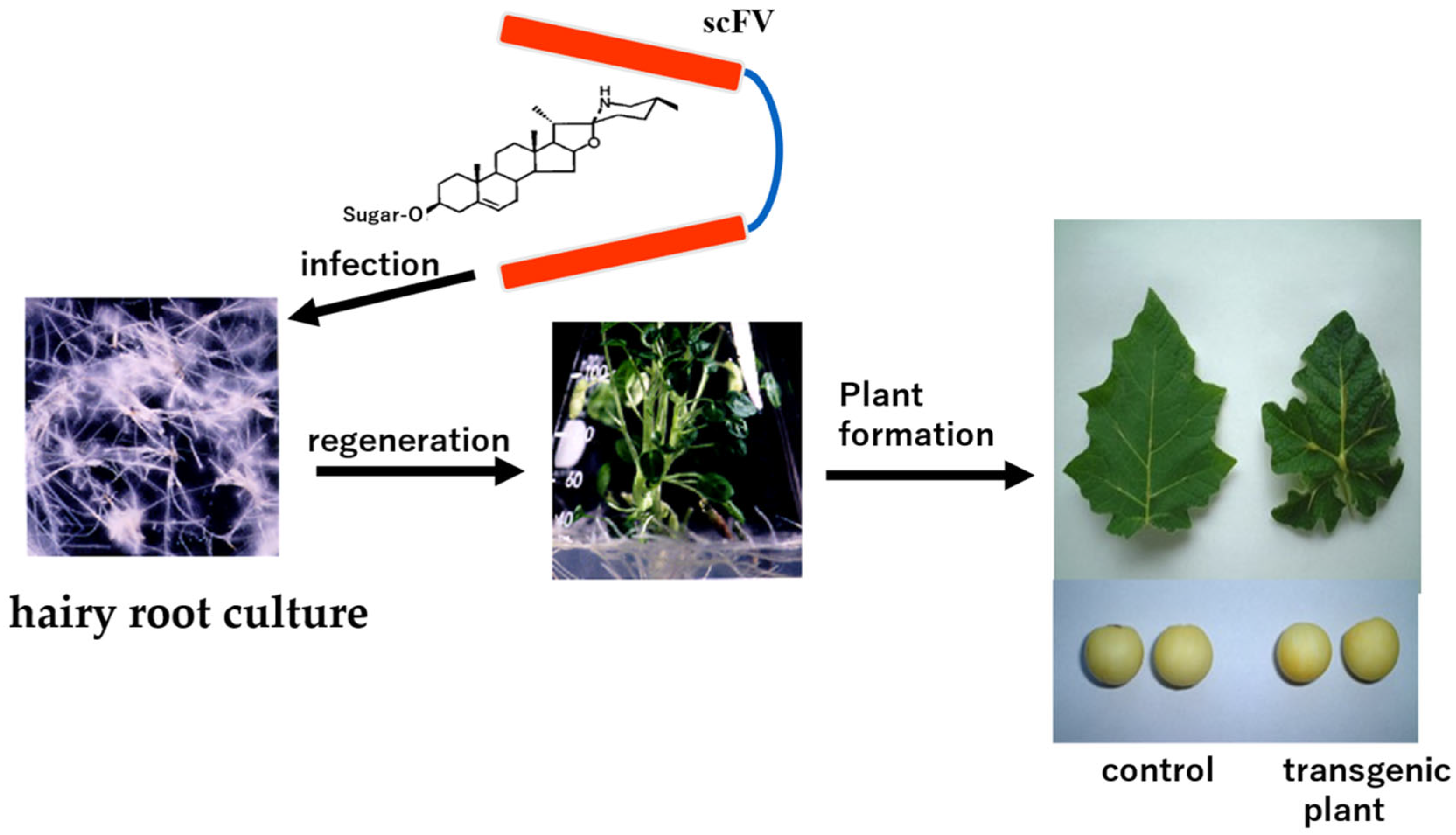 - Putalun, W.; Tanaka, H.; Sakamoto, S.; Shoyama, Y. Molecular Breeding of Solasodine Glycoside for Solanum khasianum using Anti-Solamargine Single-Chain Fv Gene. Med. Arom. Plants 2013, 2, 124. [Google Scholar] [CrossRef]