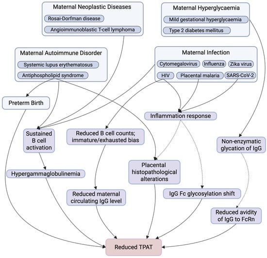 Summary of Maternal Factors Affecting TPAT. This figure summarises key maternal physiological and pathological conditions and downstream immunological and placental alterations that have been implicated in TPAT. Maternal conditions include autoimmune disorders, neoplastic diseases, infections, hyperglycaemia, and preterm birth, which may influence TPAT through multiple, potentially overlapping pathways. These include sustained B cell activation, altered B cell composition (with reduced total B cell counts and an immature or exhausted bias), hypergammaglobulinemia or reduced maternal circulating IgG levels, inflammatory responses, non-enzymatic IgG glycation, shifts in IgG Fc glycosylation, placental structure and function alterations, and reduce IgG–FcRn avidity, collectively contributing to impaired TPAT. Solid arrows indicate pathways with supportive evidence, whereas dashed arrows denote proposed or associative relationships that may not be direct, are context-dependent, or require further mechanistic investigation. Created in https://www.BioRender.com.