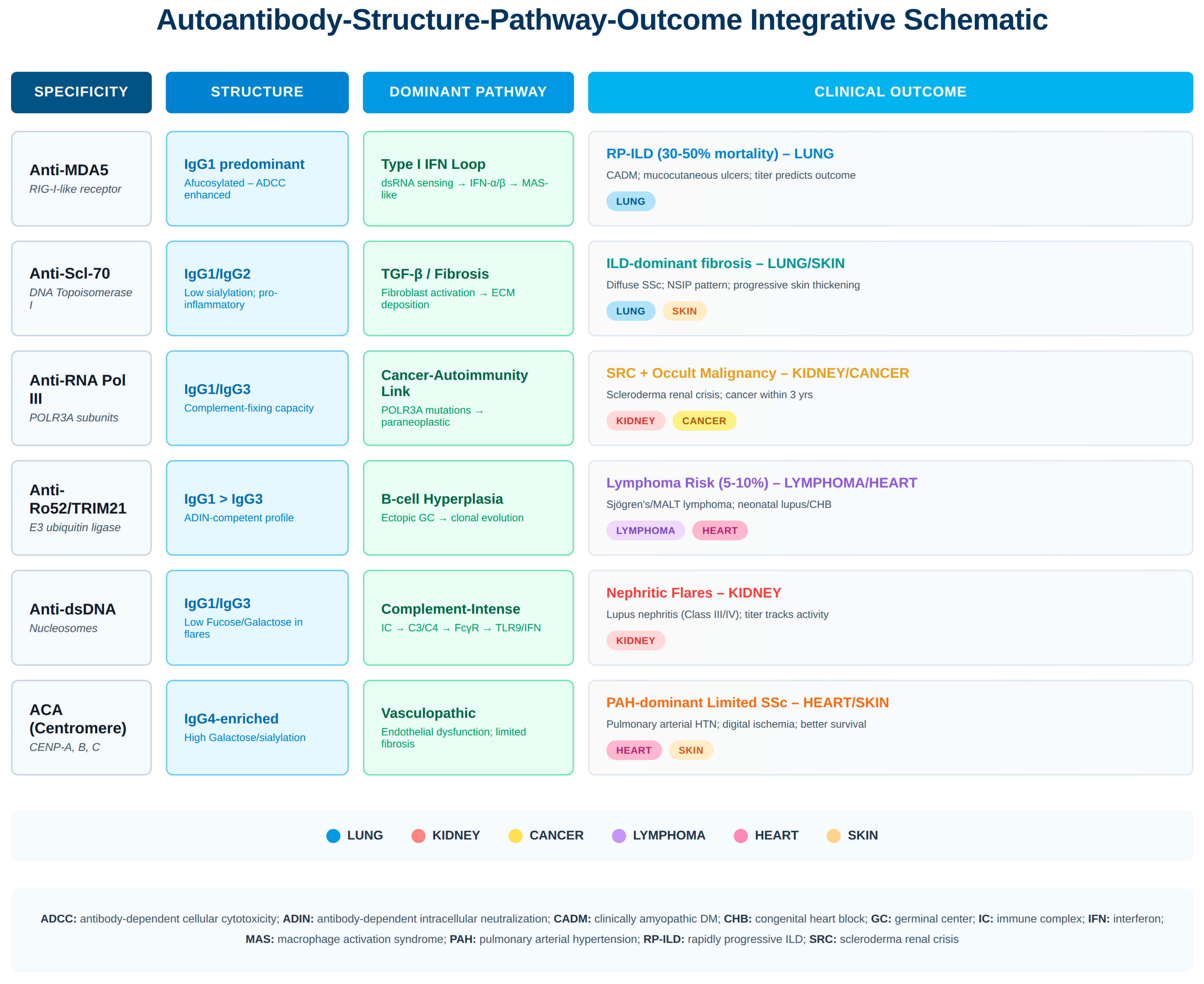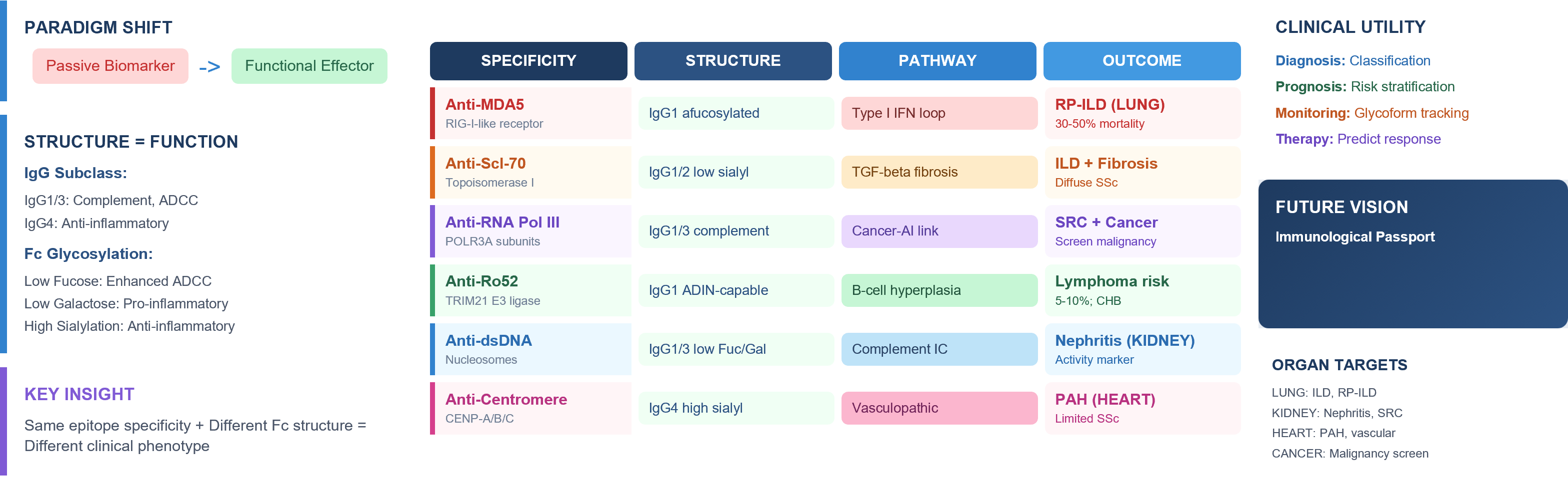 | Anti-Ro52 (TRIM21) | Sjögren’s, myositis, SSc | Type I interferon amplification | Lung, lymphoid tissue | ILD risk; lymphoma surveillance; treatment stratification |