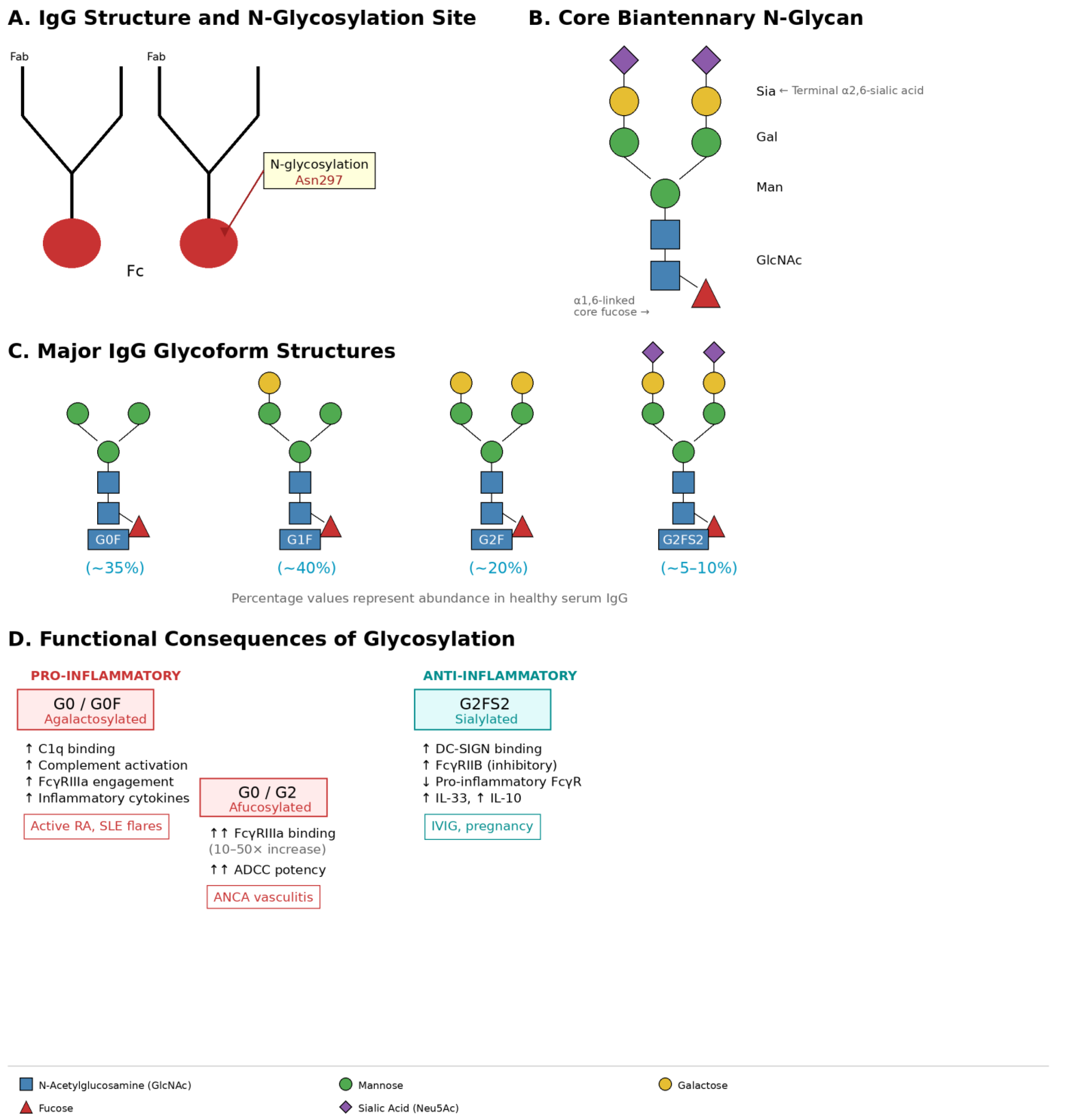 - G0F: Agalactosylated, fucosylated (most abundant in healthy individuals, ~35%);